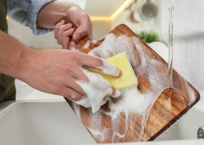 Wash your cutting boards and preparation utensils with hot, soapy water after preparing each food item. Then dry them thoroughly.